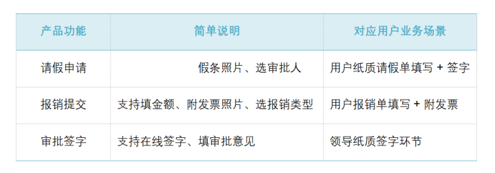 “您看这3个功能,和您办请假、报销的事对应,哪一个功能里要填的内容,比您的纸质单少了啥?”