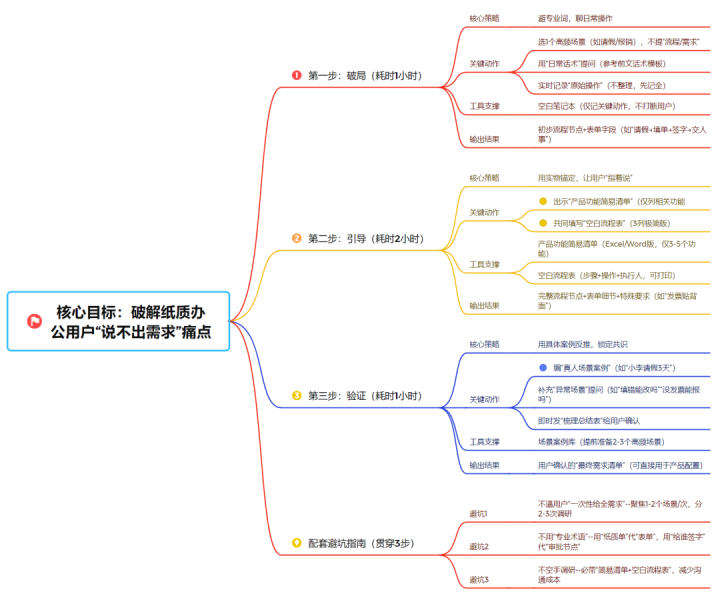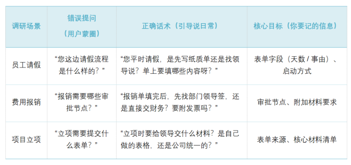 用户长期纸质办公,没梳理过流程,你让他说“审批步骤、表单字段”,他反而蒙圈;
