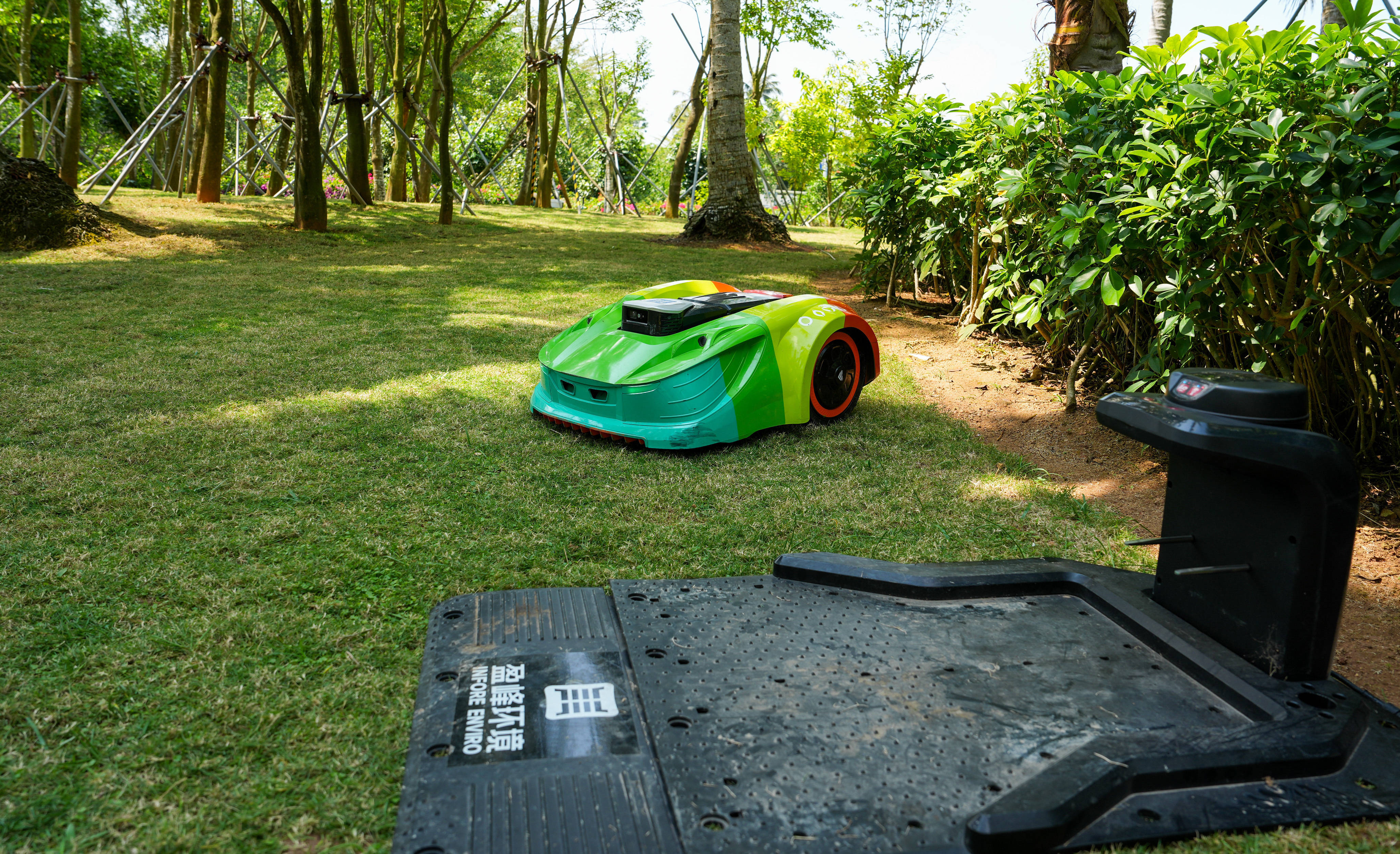 3月25日,智能无人割草机在中国(海南)南海博物馆周边草坪上作业。博鳌亚洲论坛2026年年会期间,多款智能机器人集中亮相。新华社记者 刘莲芬 摄