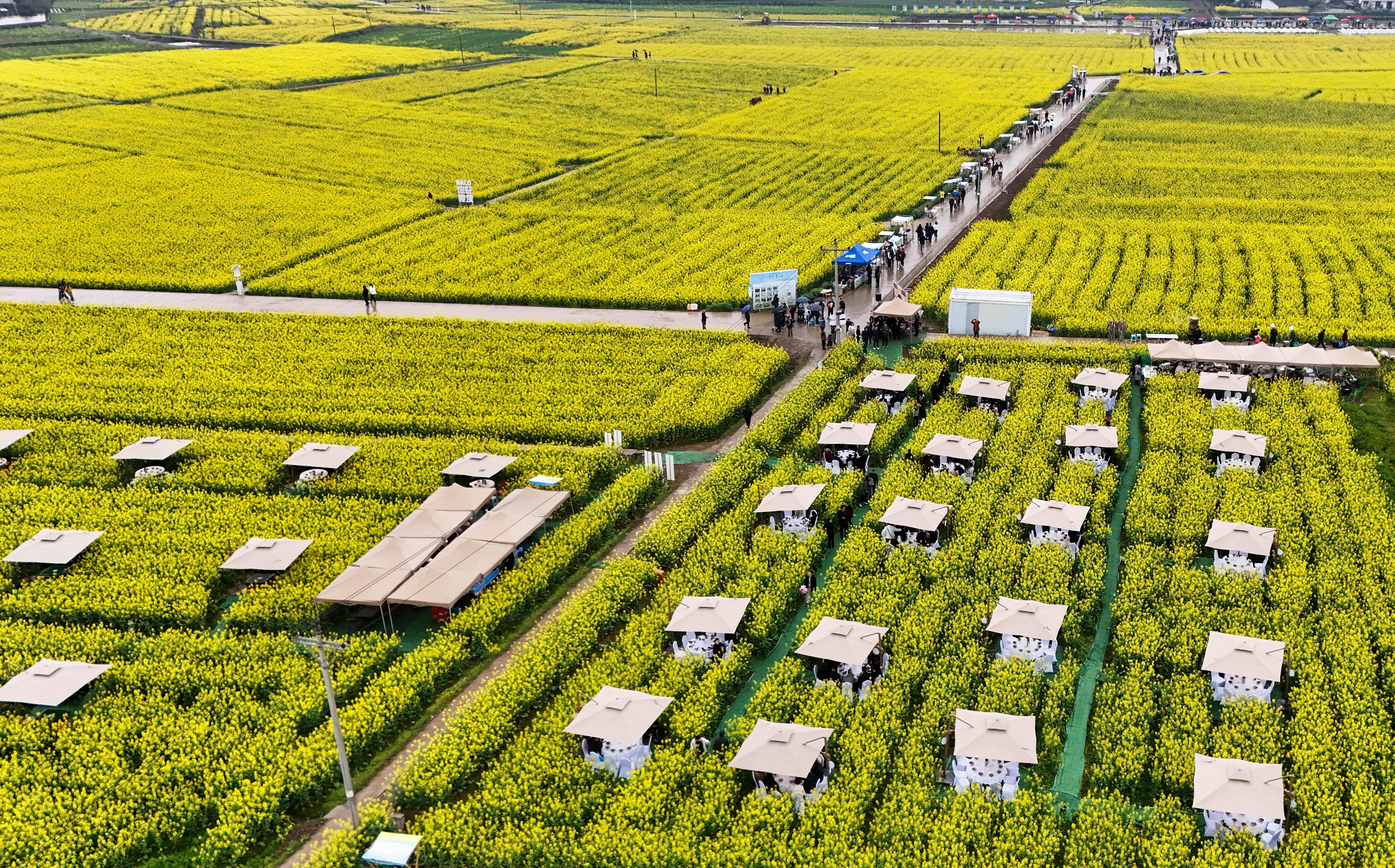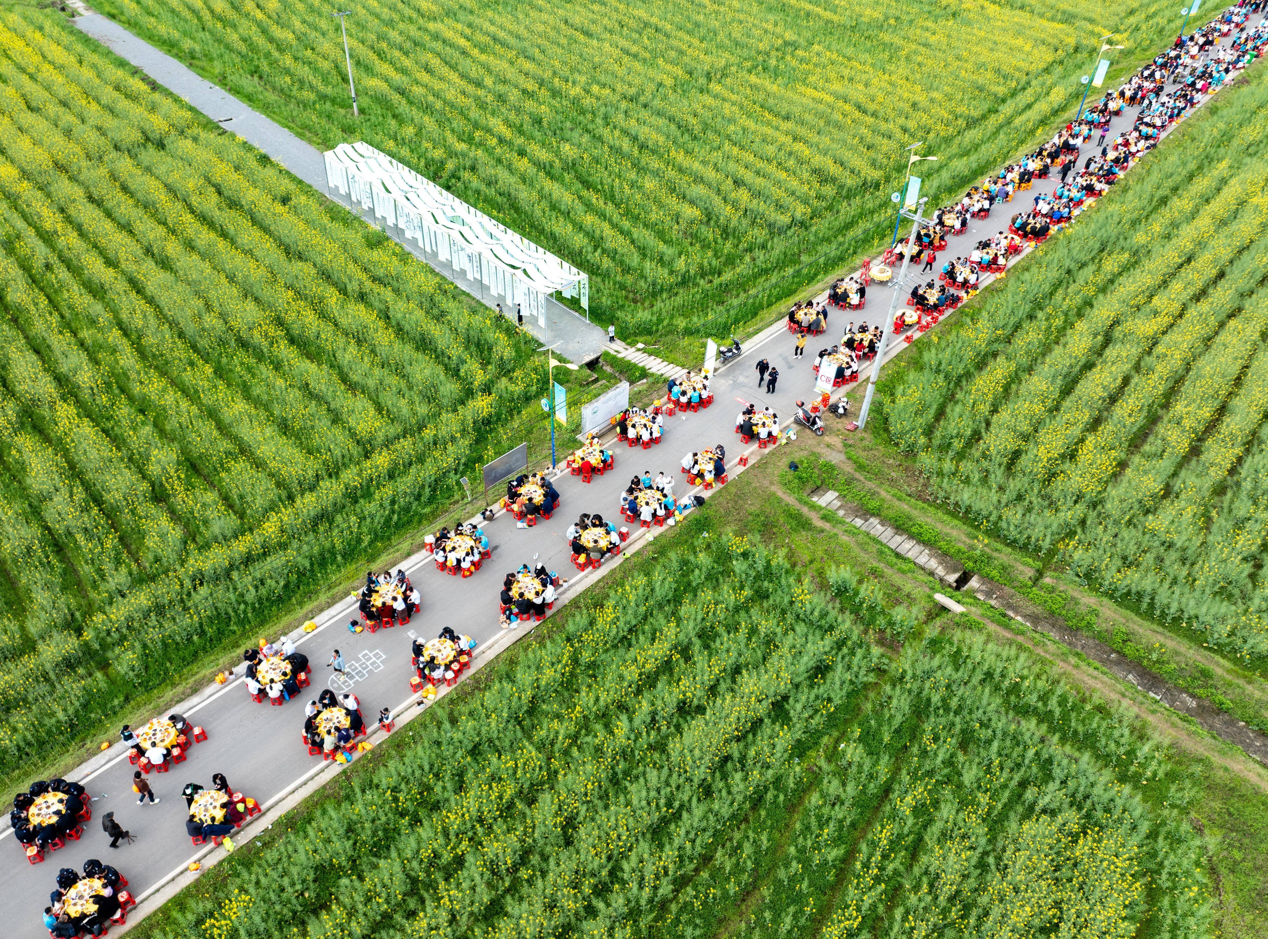 3月21日,游客在四川省广安市广安区花桥镇油菜花田间吃坝坝席(无人机照片)。新华社发(张国盛 摄)