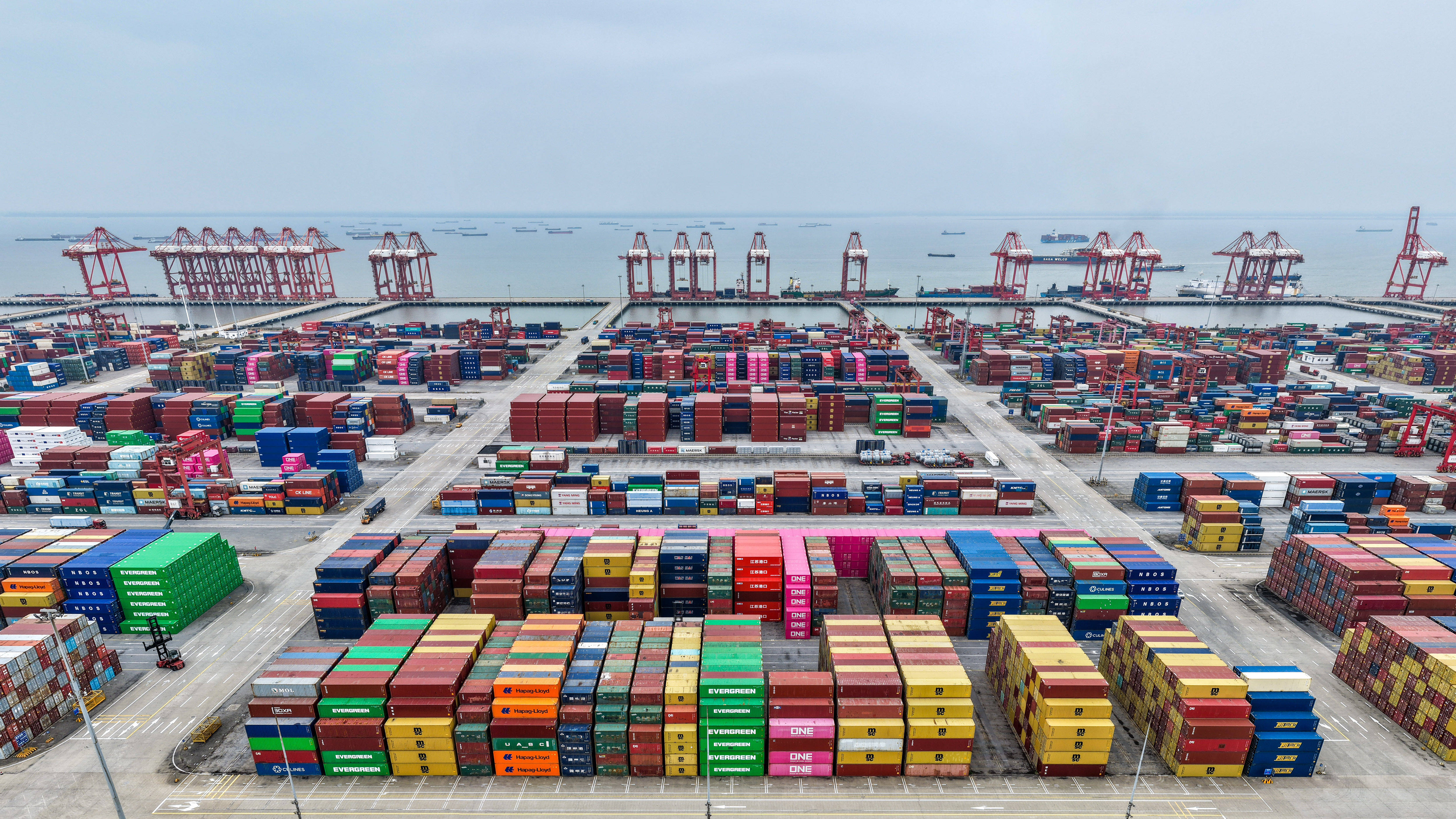 这是3月20日拍摄的江苏太仓港集装箱堆场(无人机拼接照片)。新华社记者 李博 摄