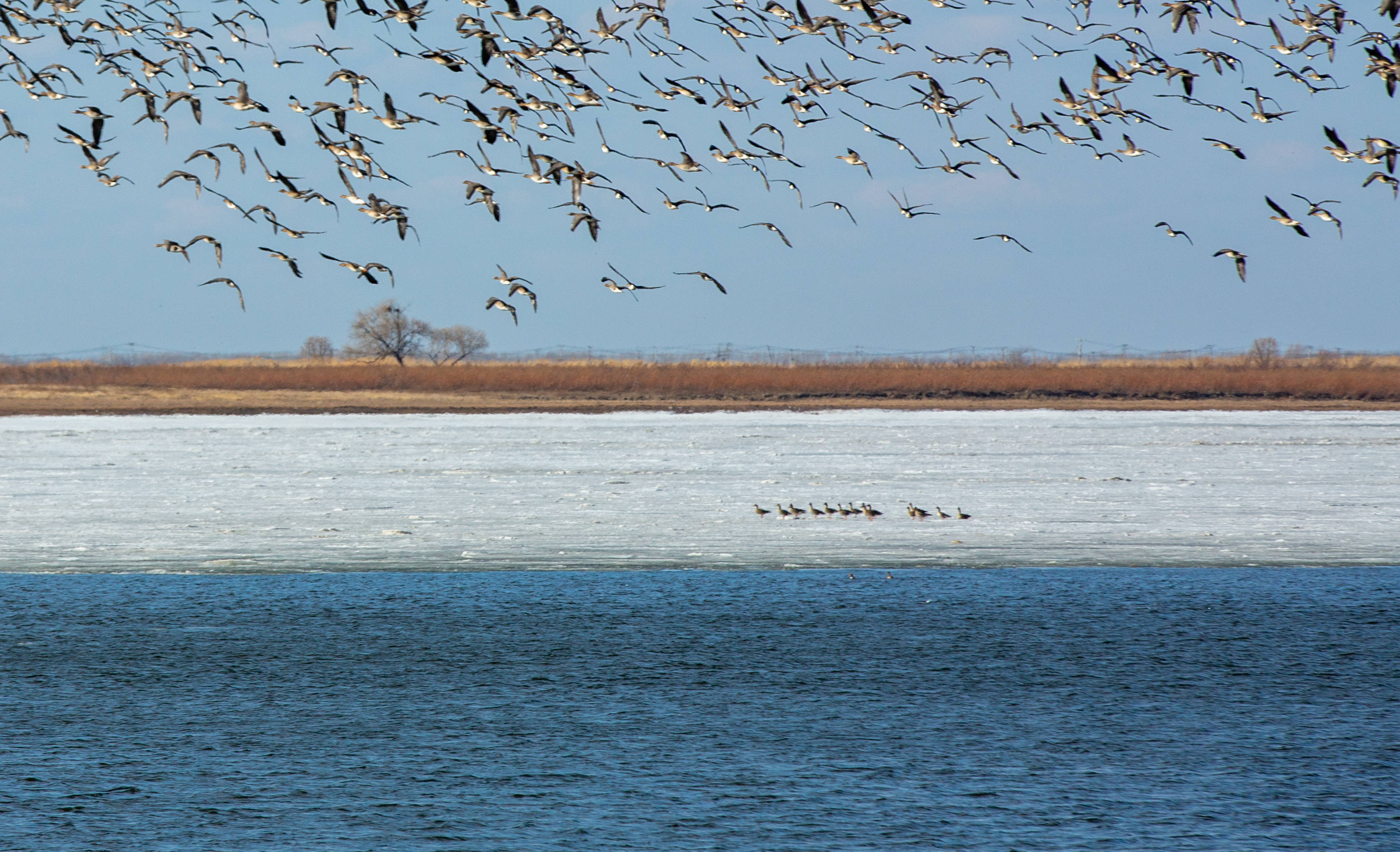 这是3月23日在松花江佳木斯段拍摄的大雁群。新华社发(陈志国摄)
