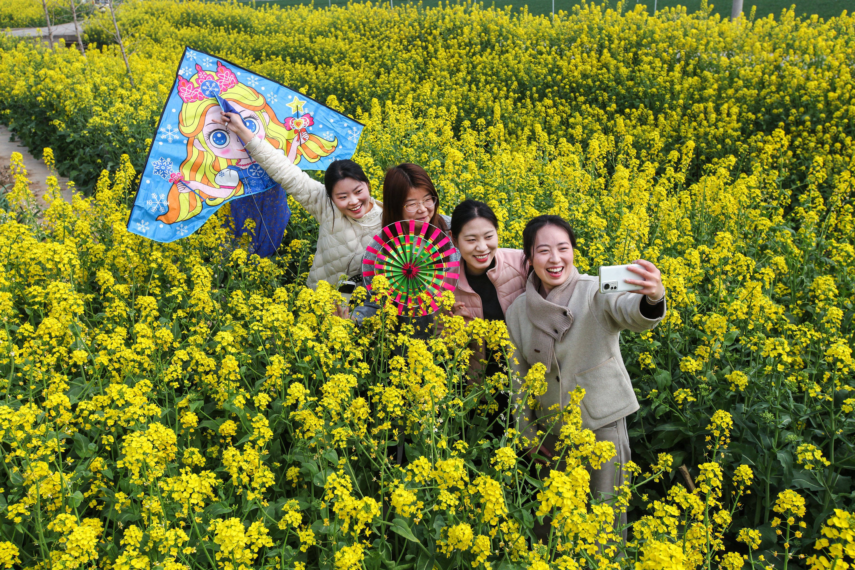 3月26日,河南省焦作市博爱县金城乡韩庄村,游客在油菜花旁拍照打卡。新华社发(程全摄)