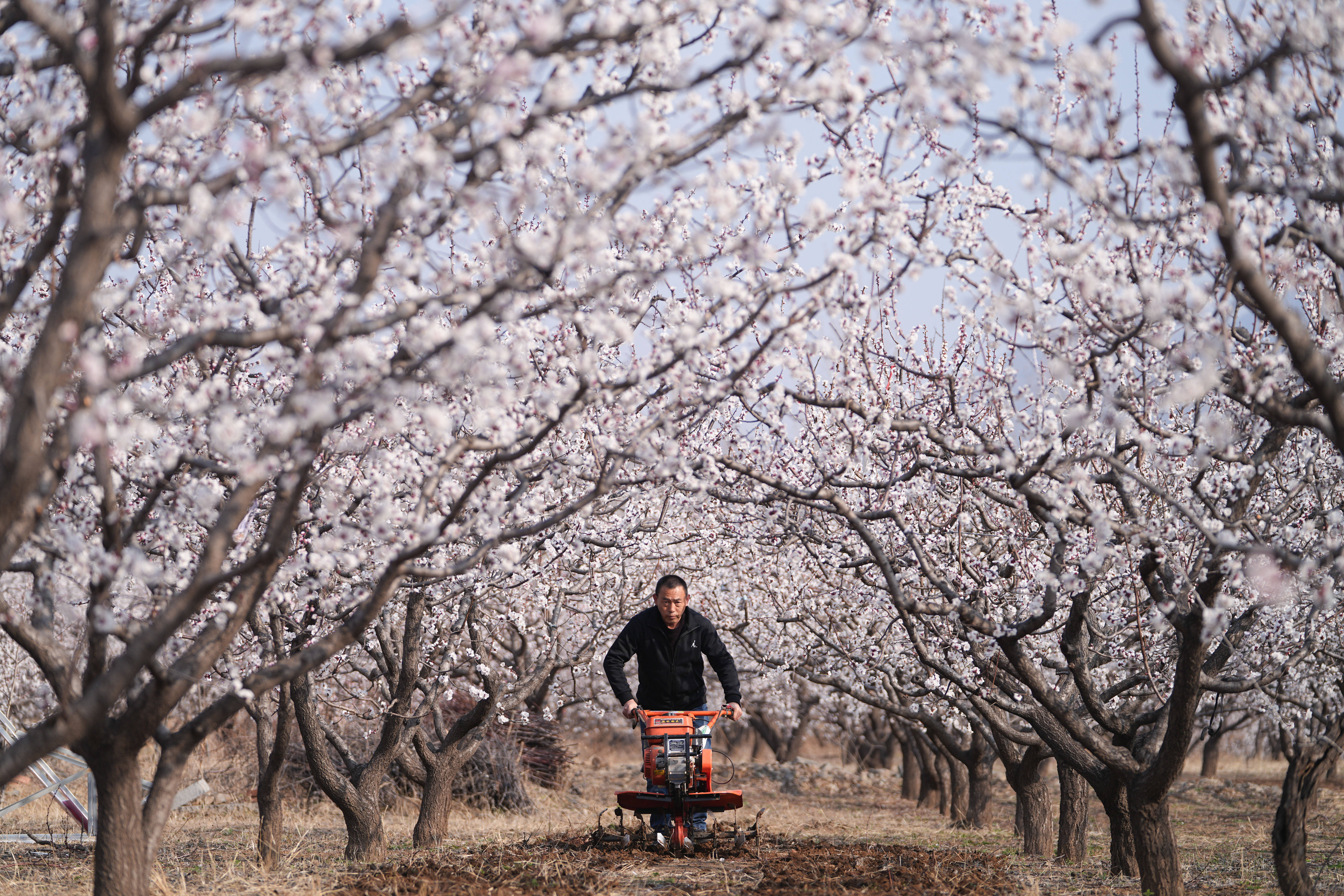 3月20日,山东省邹平市西董街道,果农在杏园松土。新华社发(董乃德摄)