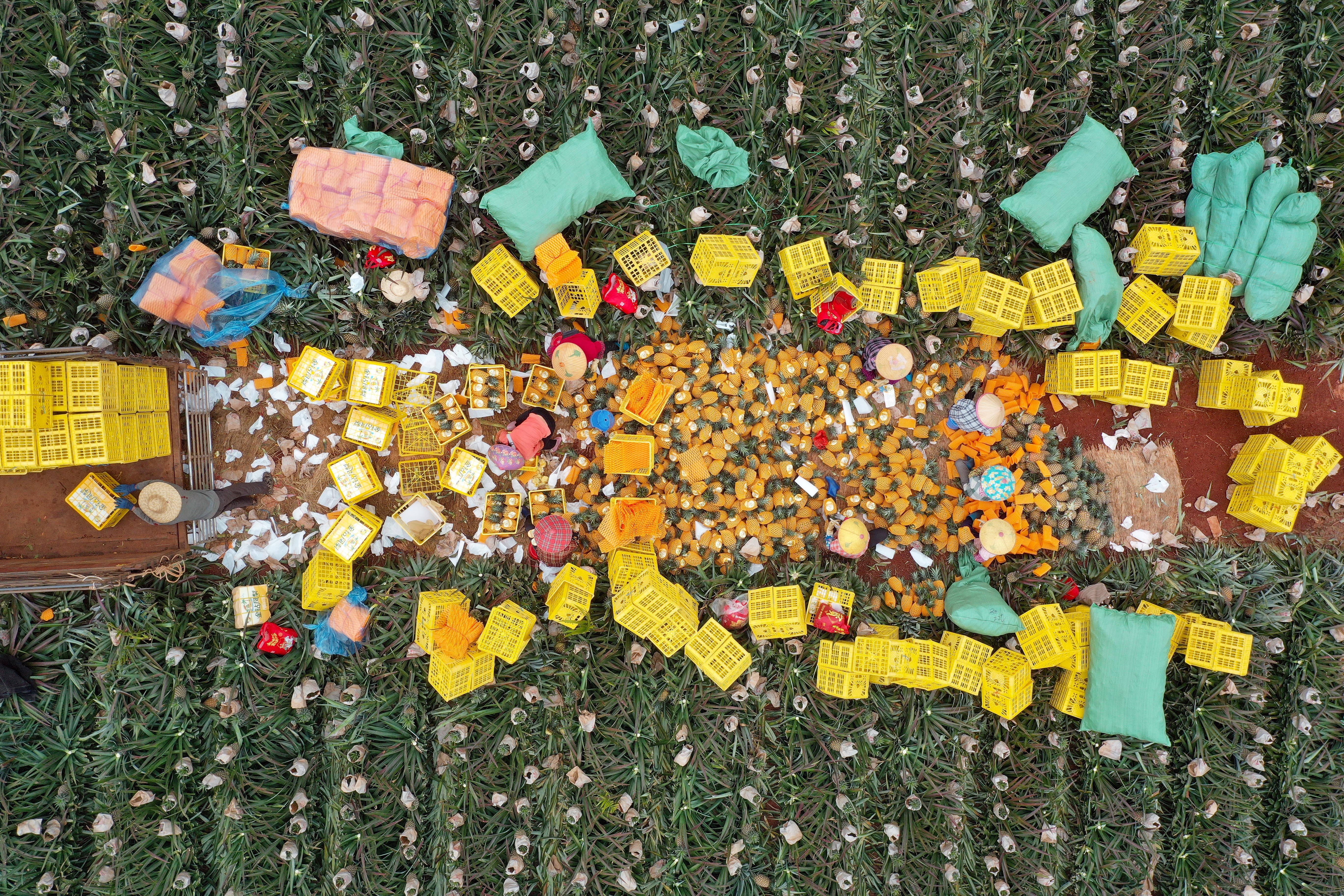 3月12日,农民在海口大坡镇将凤梨打包装箱(无人机照片)。新华社记者 郭程 摄