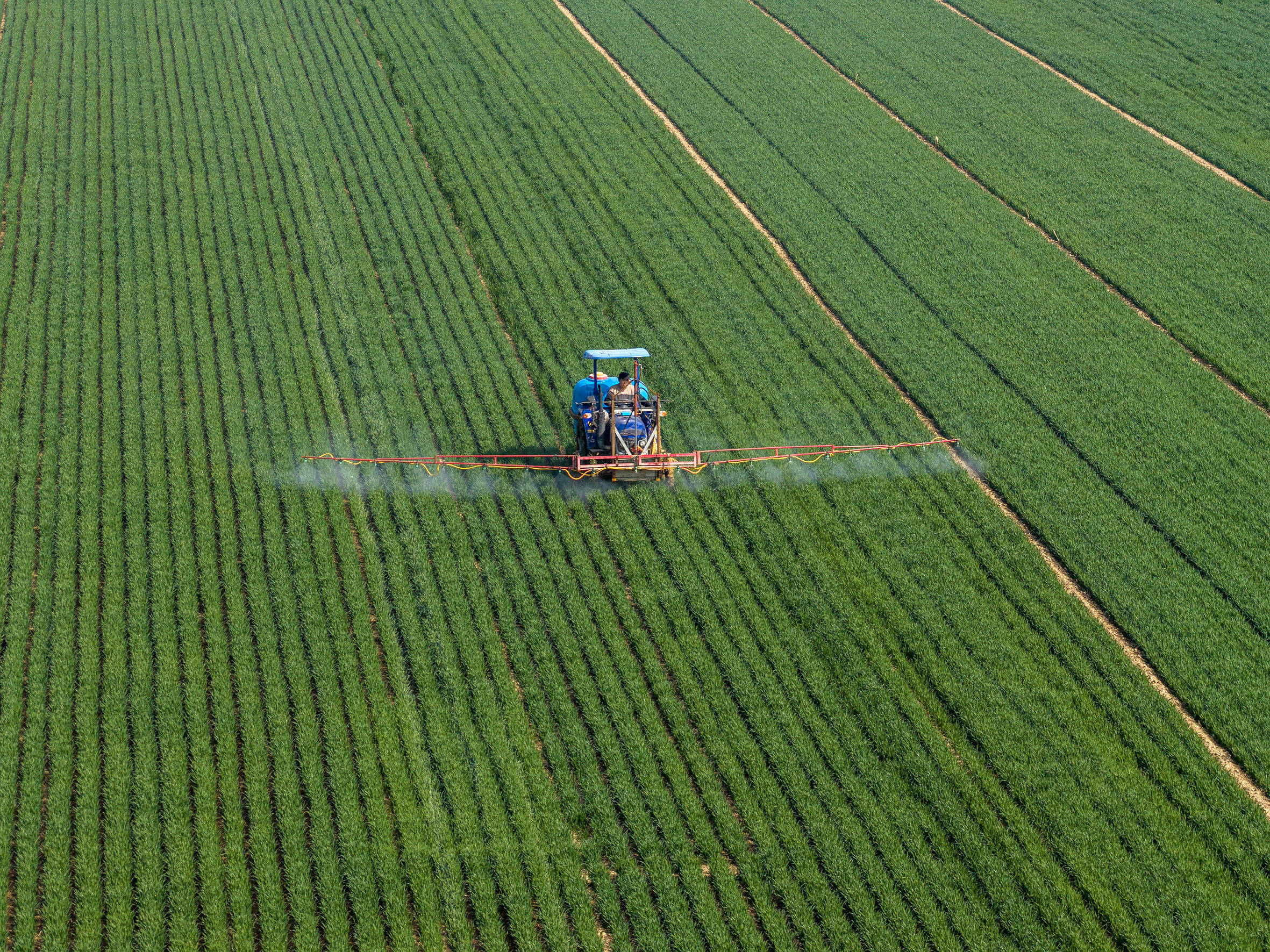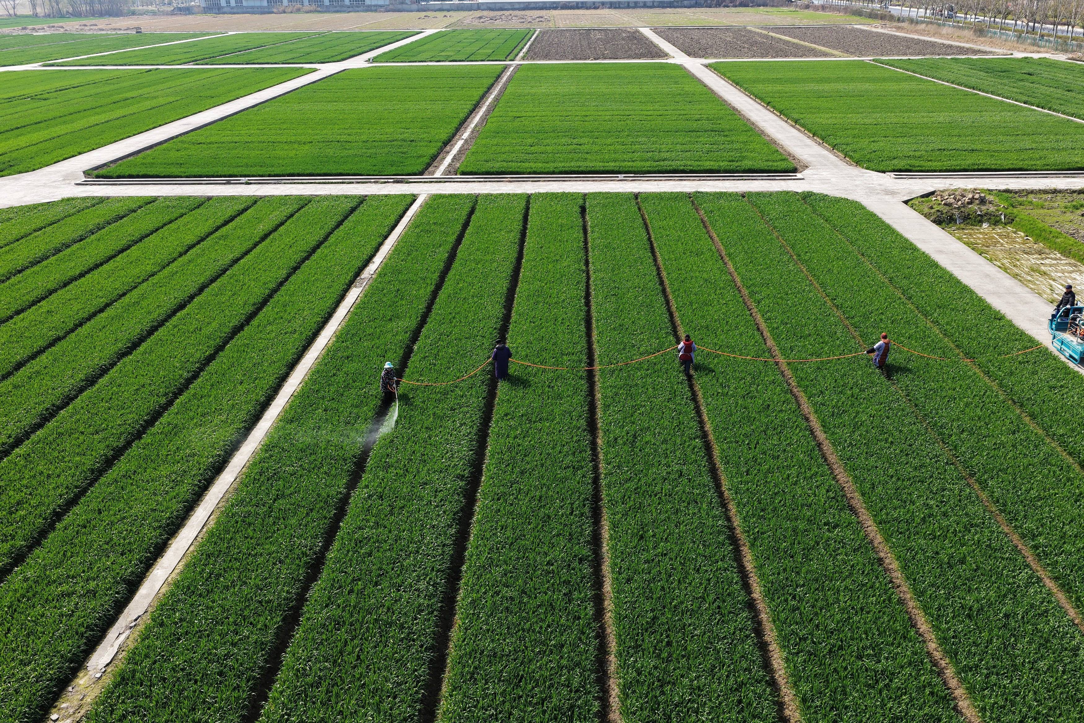 3月10日,农民在江苏里下河地区农科所(扬州市农科院)的麦田间喷洒农药(无人机照片)。新华社发(孟德龙摄)