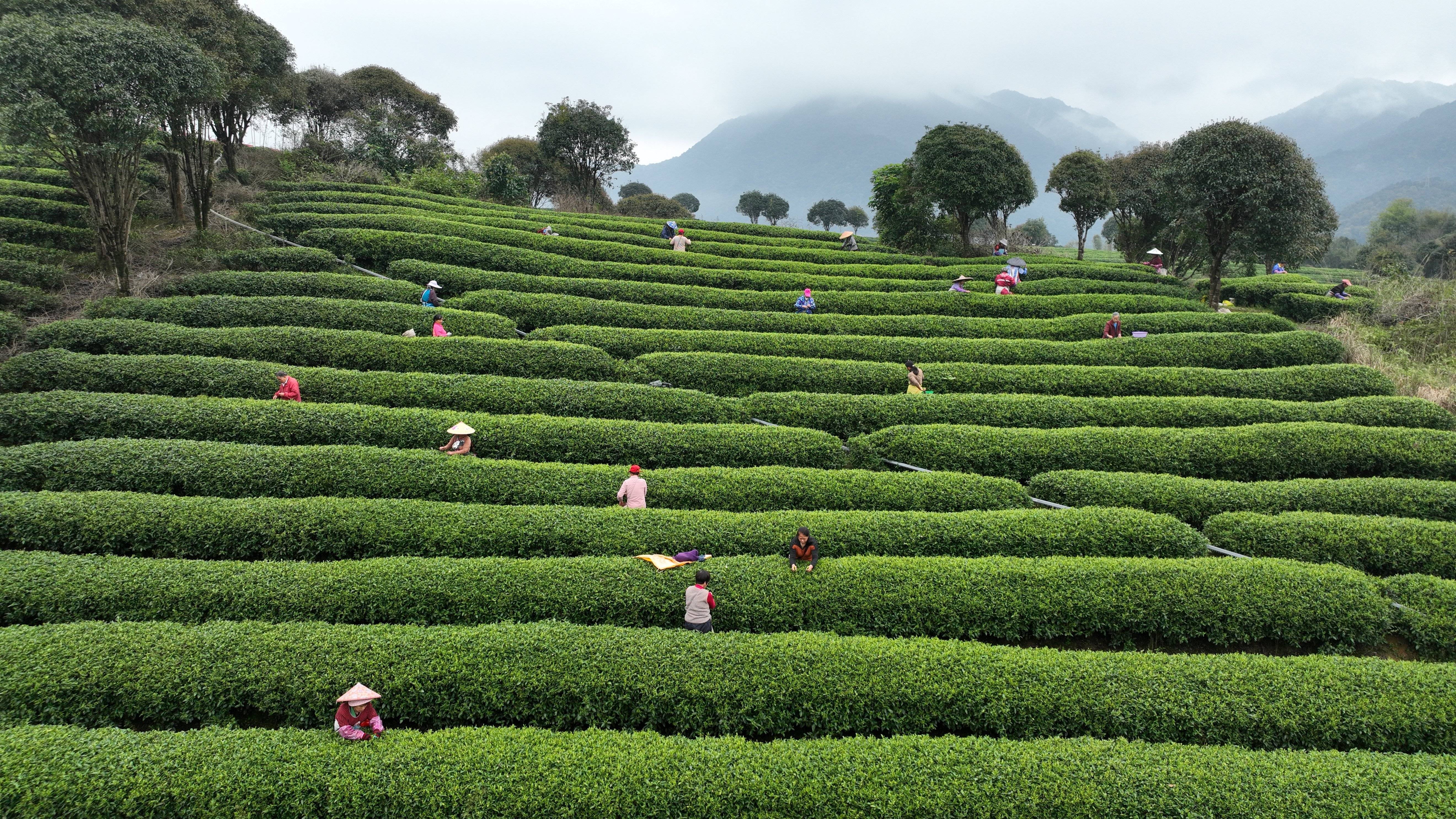 3月17日,茶农在广西昭平县昭平镇花六茶园采摘春茶。新华社发(左德强摄)