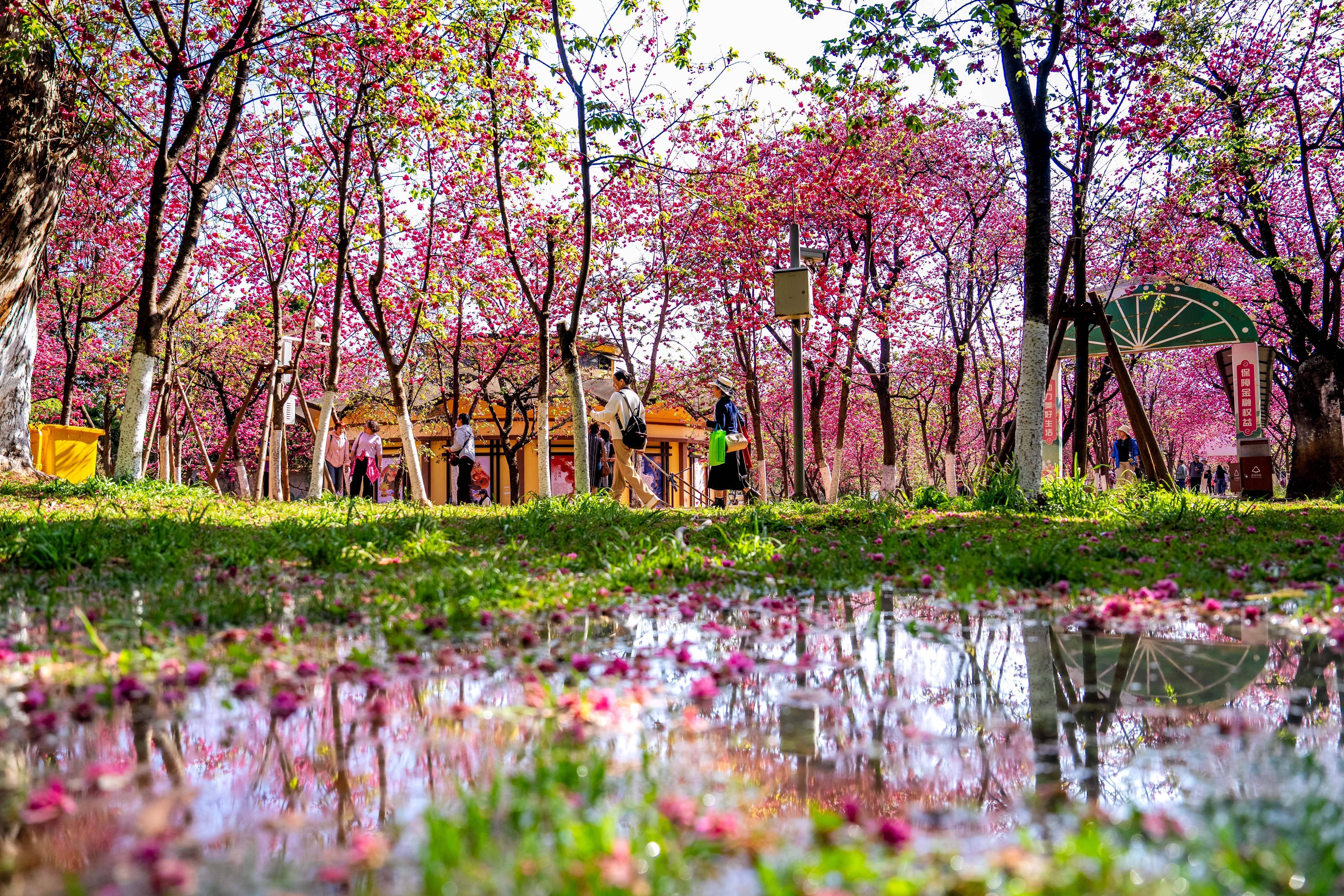 3月20日,人们在昆明圆通山公园观赏樱花。新华社记者 胡超 摄