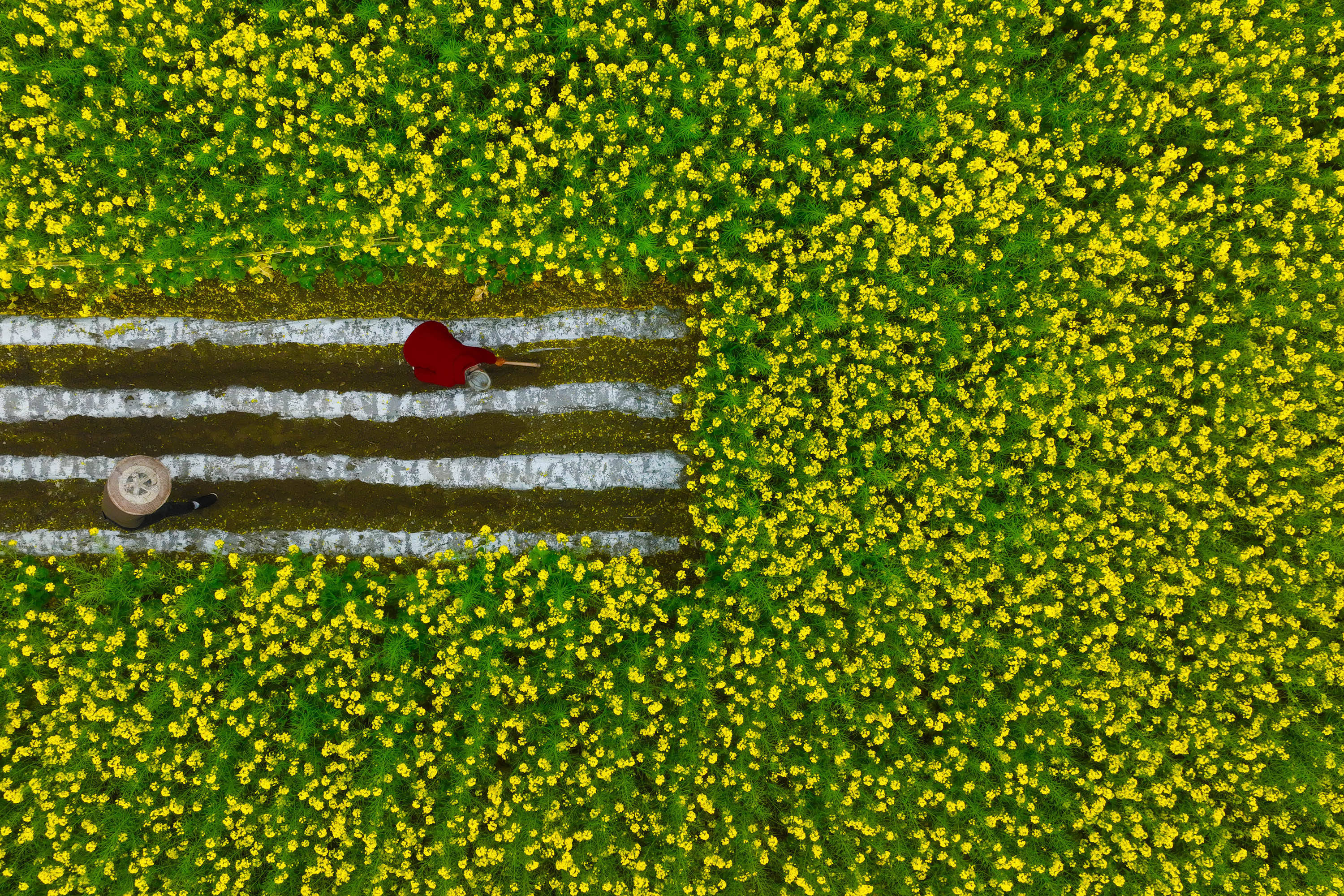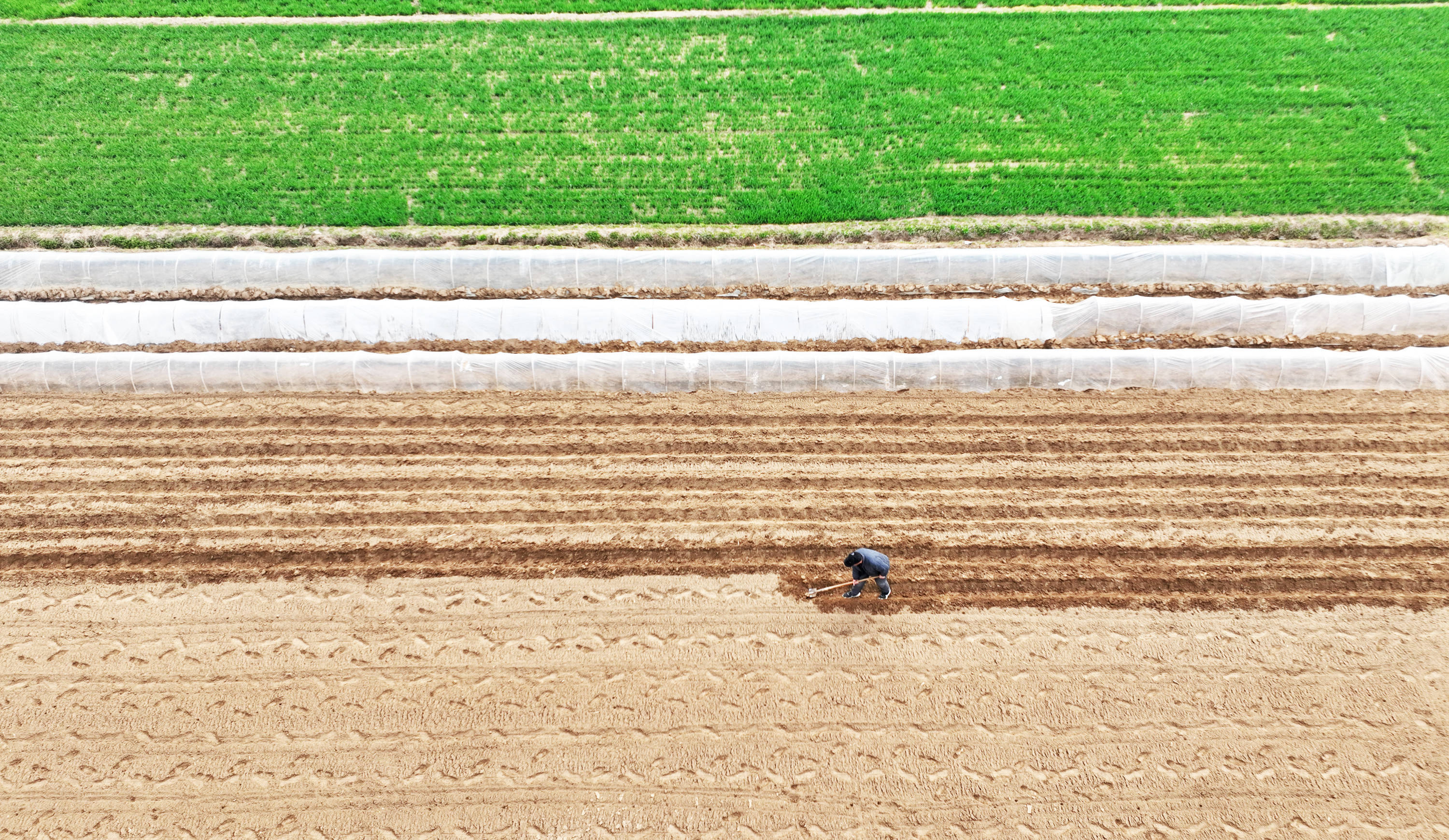 3月23日,山东省临沂市郯城县郯城街道,农民在田间劳作(无人机照片)。新华社发(张春雷摄)