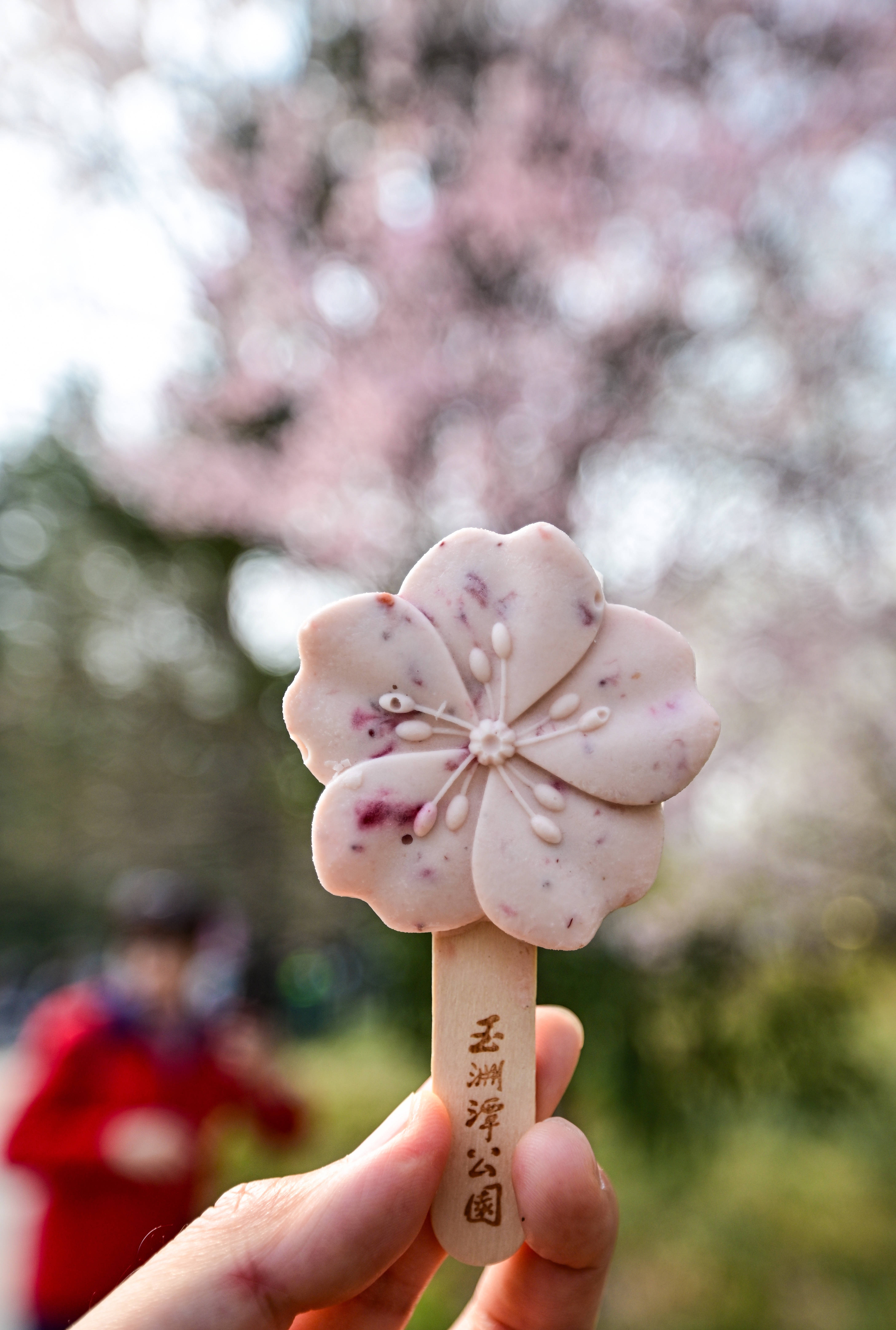 3月23日,在北京玉渊潭公园,游人展示樱花主题文创冰淇淋。新华社记者 陈晔华 摄