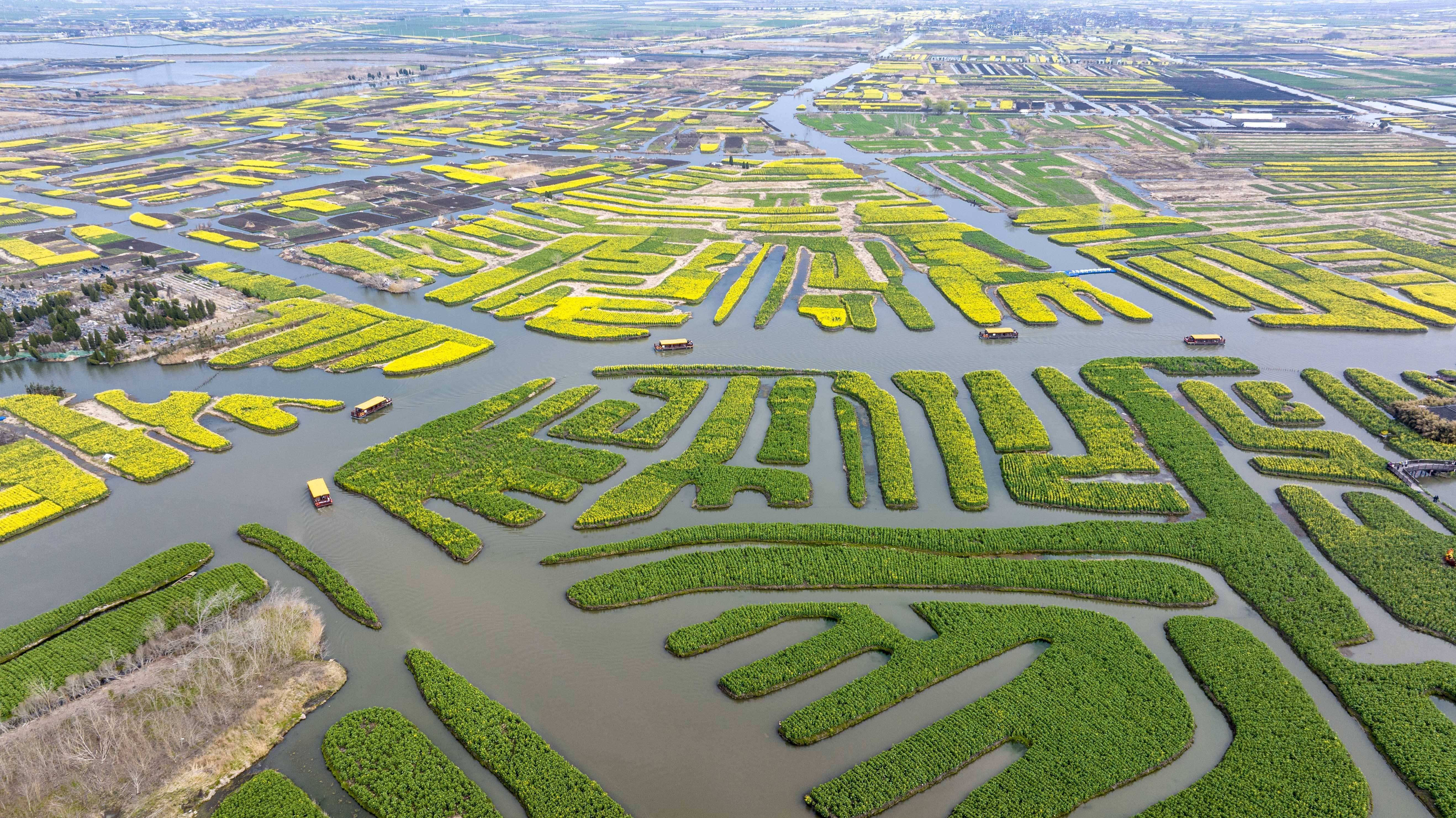 3月19日,游客乘船在江苏省兴化市千垛景区赏花游玩(无人机照片)。新华社发(顾继红 摄)