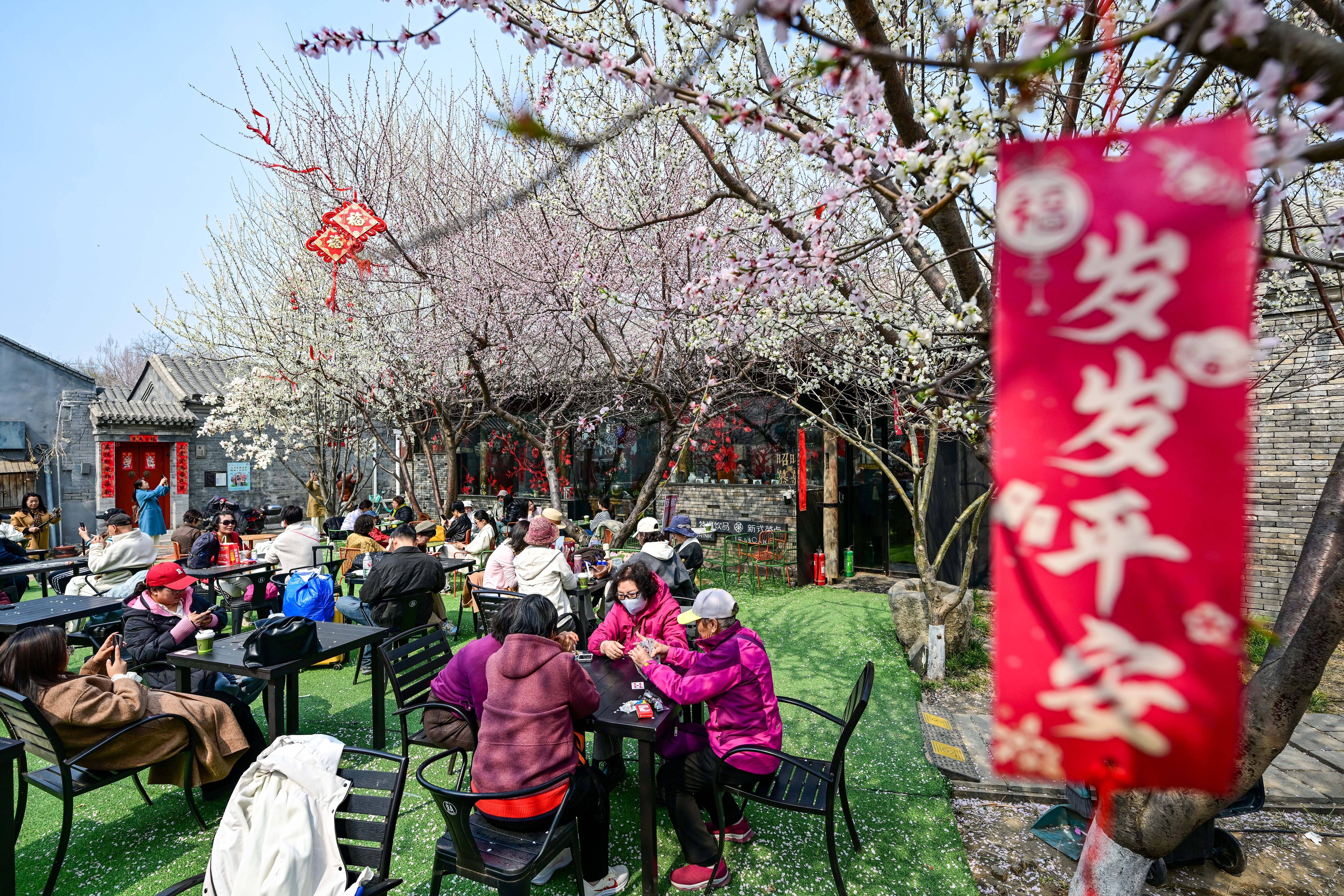 3月23日,游人在北京三里河公园一家饮品茶点店消费休闲。新华社记者 陈晔华 摄