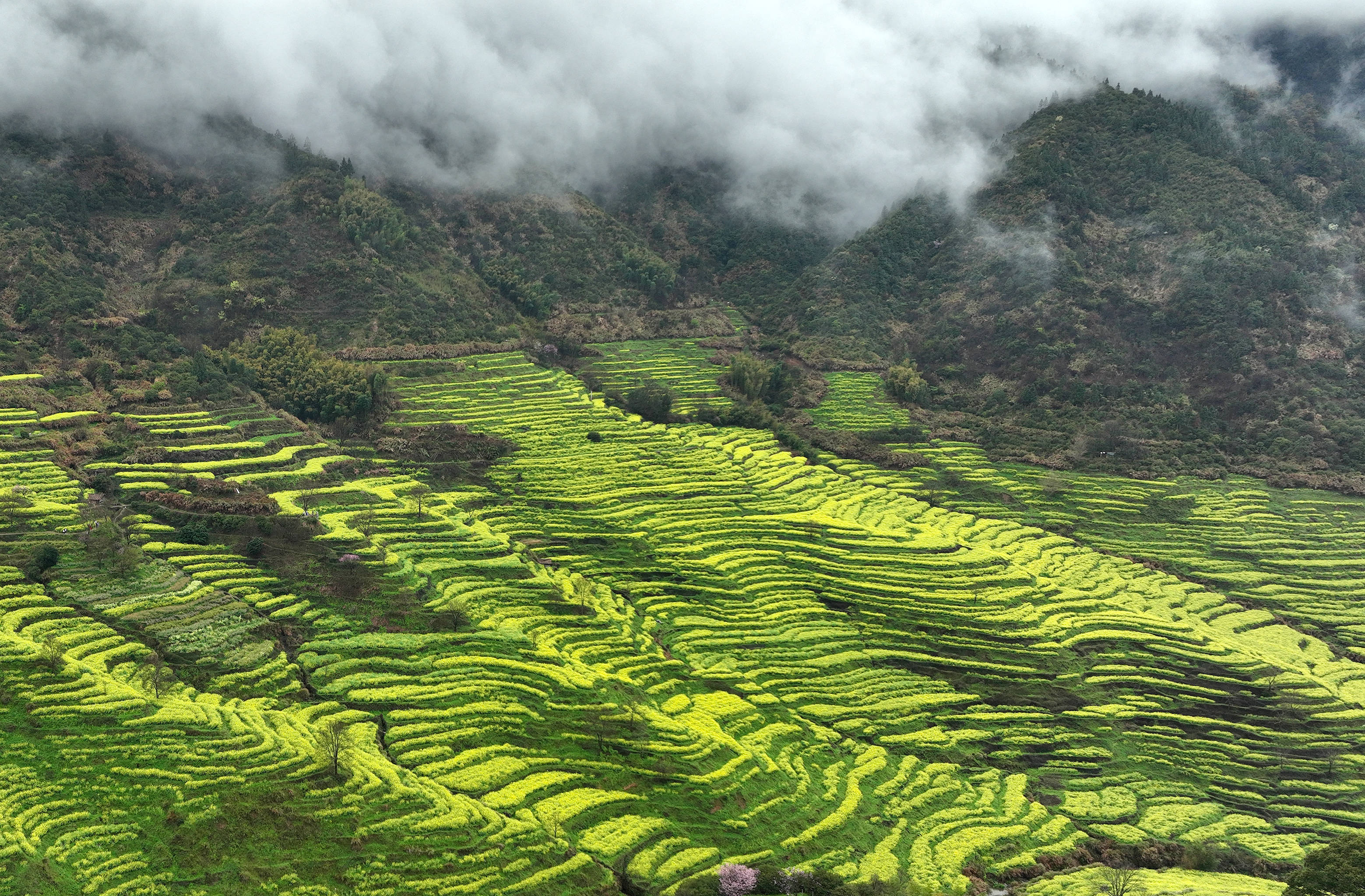 3月22日,游人在安徽省黄山市歙县霞坑镇石潭村春游赏花(无人机照片)。新华社发(樊成柱摄)