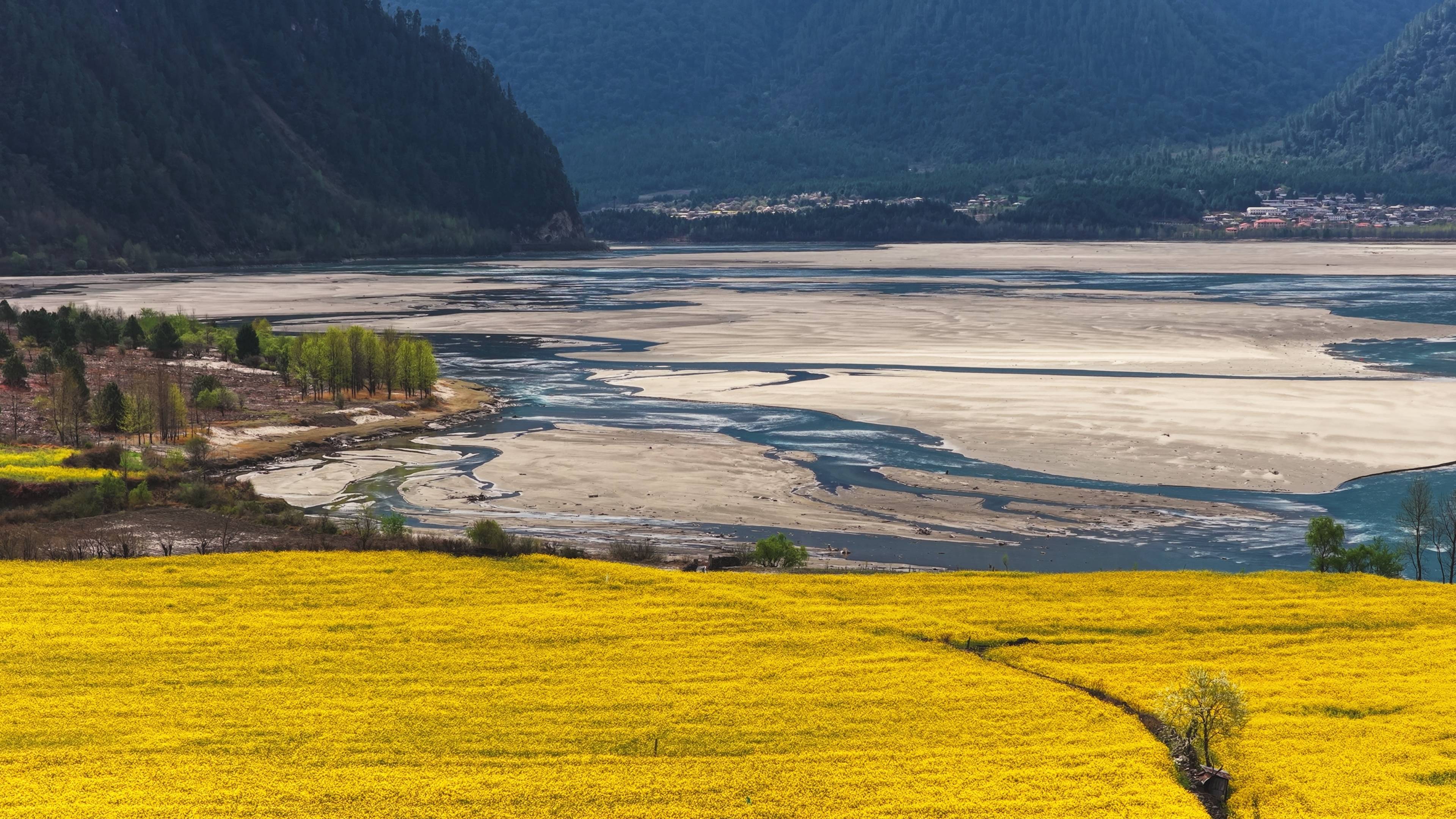 3月20日拍摄的西藏林芝市波密县易贡乡的油菜花田(无人机照片)。新华社记者 普布次仁 摄