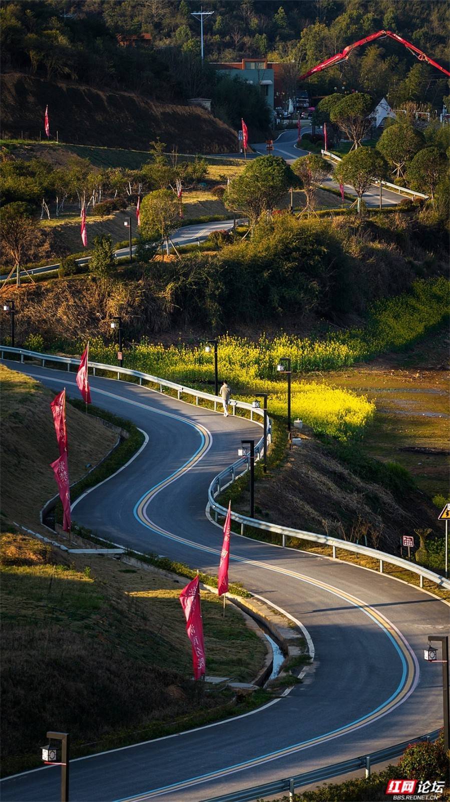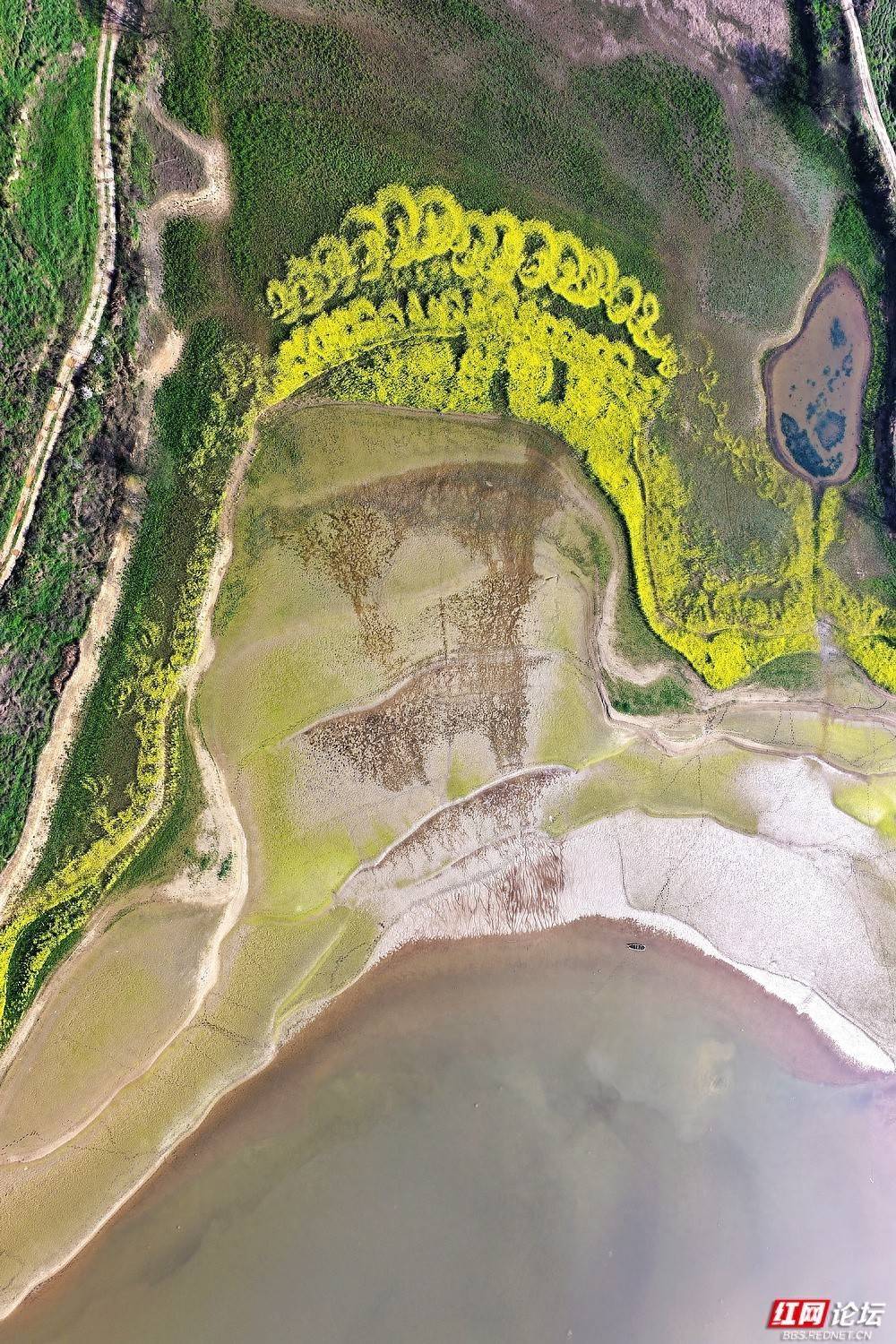 从空中俯瞰,金黄的油菜花沿着湖岸蜿蜒铺展,其轮廓灵动飘逸,浑然天成,竟宛若戏曲花旦头顶那精美繁复的头冠,在春风中微微摇曳,韵味十足。这里没有刻意的雕琢,唯有春风执笔、大地为卷,将乡野的蓬勃生机与东方的传统美学巧妙相融。