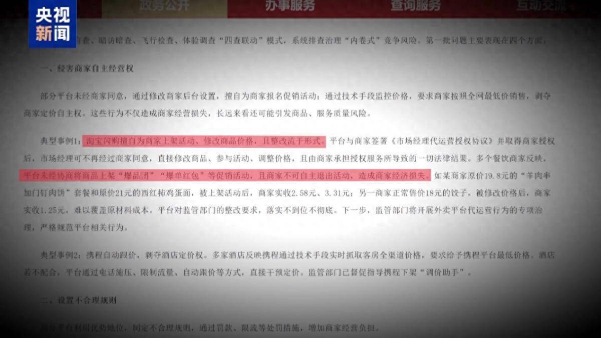近日,央视新闻专题报道外卖平台严重侵害商家自主经营权、设置不合理规则等乱象,曝光外卖平台随意篡改平台内商户价格、私自上架“爆品团”低价活动等问题。