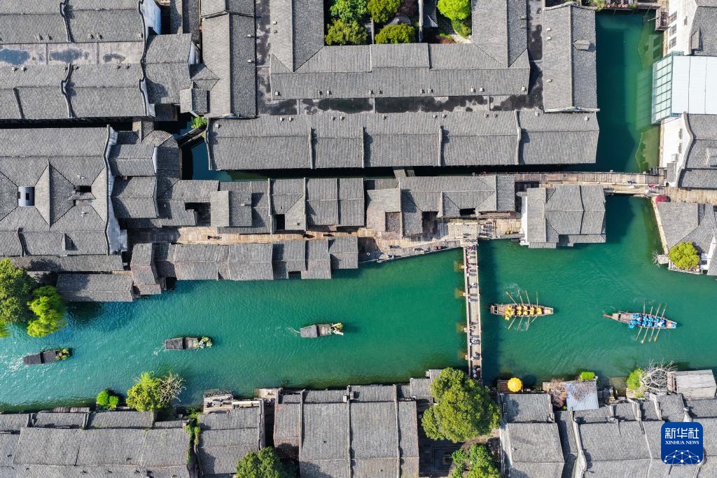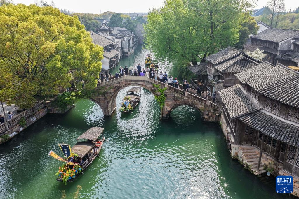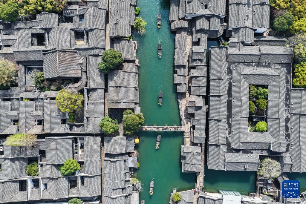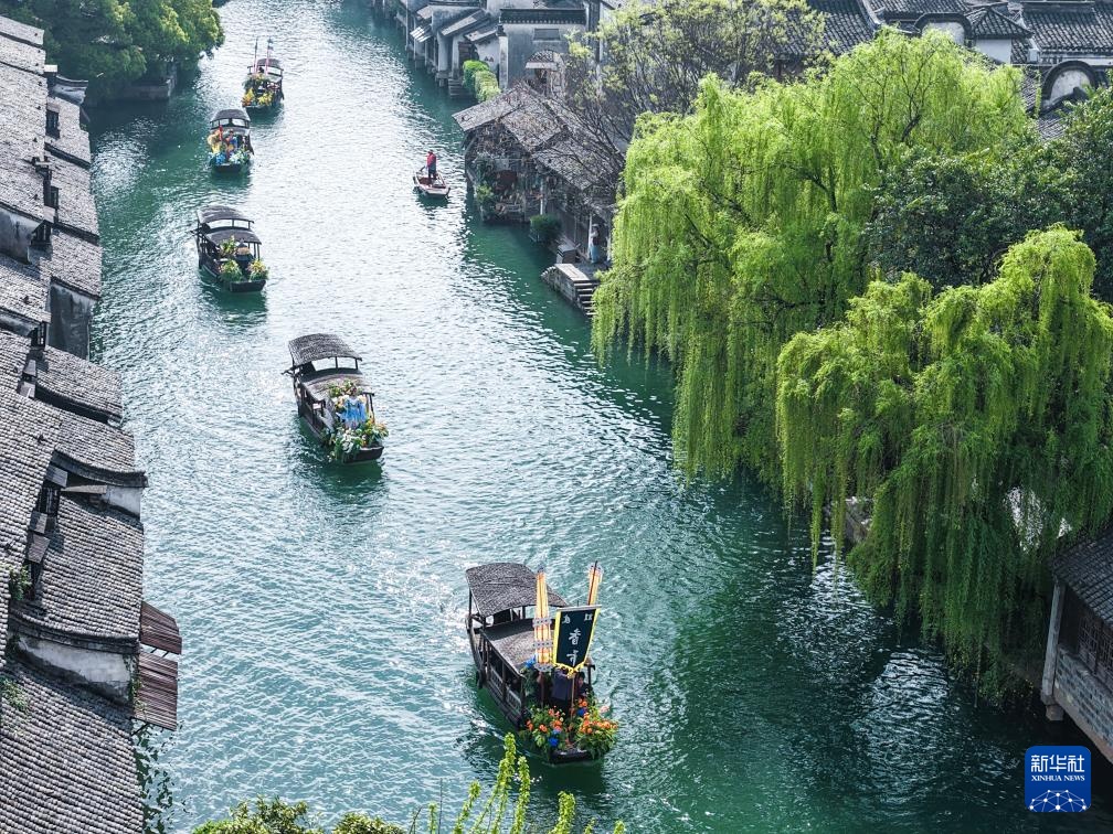 4月1日,乌镇香市蚕花盛会的船队在河道上巡游表演(无人机照片)。新华社记者 徐昱 摄