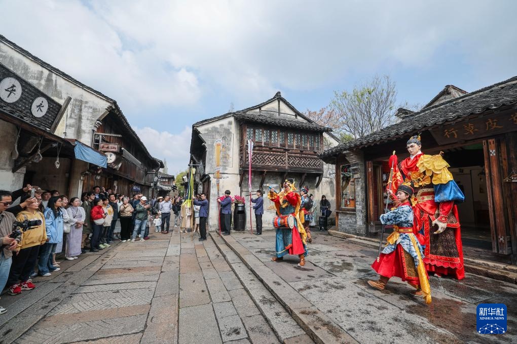 4月1日,乌镇香市蚕花盛会的巡游队伍在古镇的街市上巡游表演。新华社记者 徐昱 摄