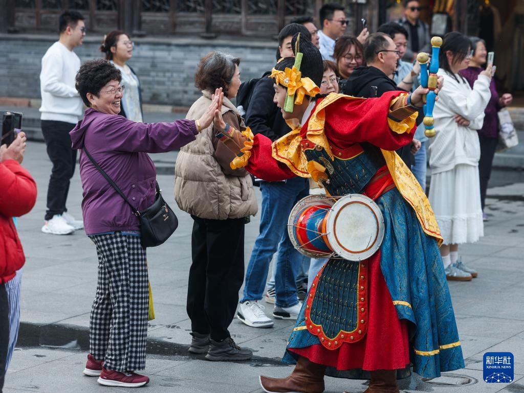 4月1日,参加乌镇香市蚕花盛会的巡游演员在古镇的街市上与游客互动。新华社记者 徐昱 摄