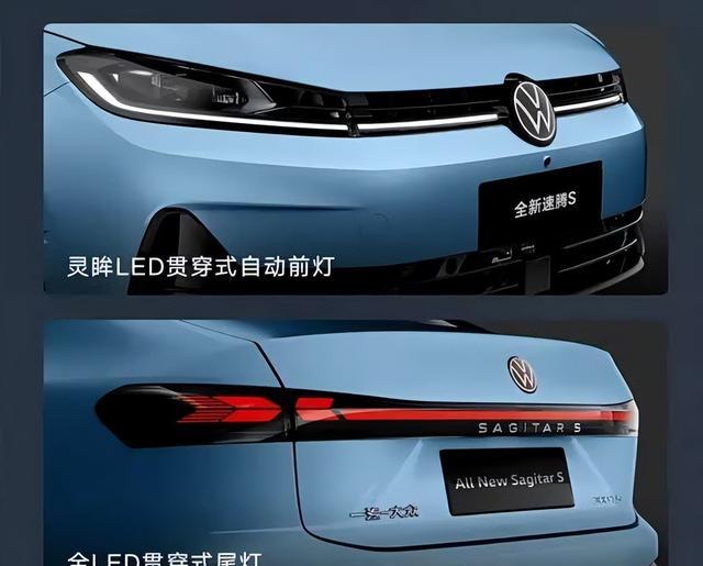 车身尺寸长宽高为4702mm/1815mm/1484mm,车身轴距2688mm,比速腾L更紧凑。车身配色主打色“丹宁蓝”,配溜上背线条、车尾专属“SAGITAR S”标识和小鸭尾,整体偏向运动感。